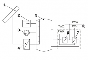 FWS: Estación de agua caliente instantánea, TWW: Salida de agua caliente. TWK: la circulación del agua caliente. El Acumulador patentado: La energía es estratificada en todo momento en el acumulador. Todas las entradas y salidas de energía al sistema están perfectamente estratificadas. Esto hace aumentar la eficiencia del sistema enormemente. El agua caliente que sale a los puntos de consumo nunca está acumulada. El agua fría de red se hace pasar por la estación de ACS instantánea, y se calienta al paso por el intercambiador. Por lo tanto, no hay agua caliente estancada y, de esa forma se evita completamente el riesgo de legionella en el sistema. Igualmente es calentado el retorno de recirculación, en otro intercambiador independiente para aumentar la eficiencia de transmisión de energía. Una de las características importantes es la absoluta estabilidad en la temperatura que le llega al usuario.